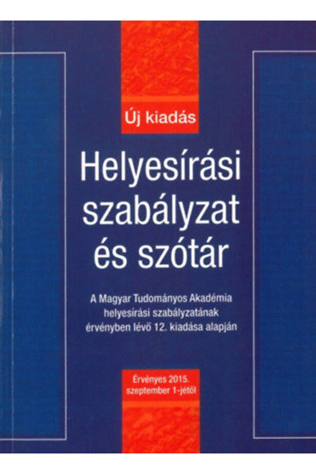 A Helyesírási szabályzat és szótár tartalmazza a Magyar Tudományos Akadémia új, 2015 szeptemberétől érvényes helyesírási szabályzatát. Szótárunkat friss, mai, gyakran előforduló példákból állítottuk össze, a szavak mellett pedig feltüntettük a vonatkozó szabálypontokat is. Ahol szükségesnek találtuk, megadtuk a szó eredetét, kiejtését, szófaját, rövidítését vagy helyes elválasztásának módját.
