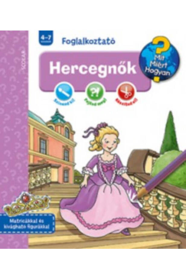 A Ravensburger Mit? Miért? Hogyan? Foglalkoztató sorozatának e kötete a hercegnők életével ismerteti meg az apróságokat. Kiből lesz hercegnő, hogyan öltözködtek a hercegnők, kivel laktak, és mi mindent kellett megtanulniuk? A foglakoztató játékos feladatait megoldva a gyerekek e kérdésekre is megkapják a választ. A kifestőkből, különféle rajzos rejtvényekből, valamint "csináld magad" játékokból és kísérletekből összeállított foglalkoztatókat tömören összefoglalt tudományos ismeretek teszik még gazdagabbá.